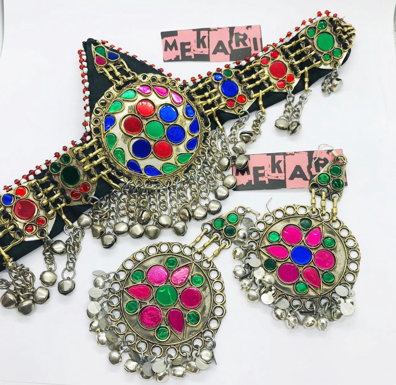 Make a bold statement with the Afghani Mathaptti, a striking headpiece inspired by rich Afghan heritage. Crafted with layered ghungru chains and vibrant multi-colored stones, it blends traditional elegance with a daring modern flair. Complete with matching earrings, this set is perfect for standing out at any special occasion.