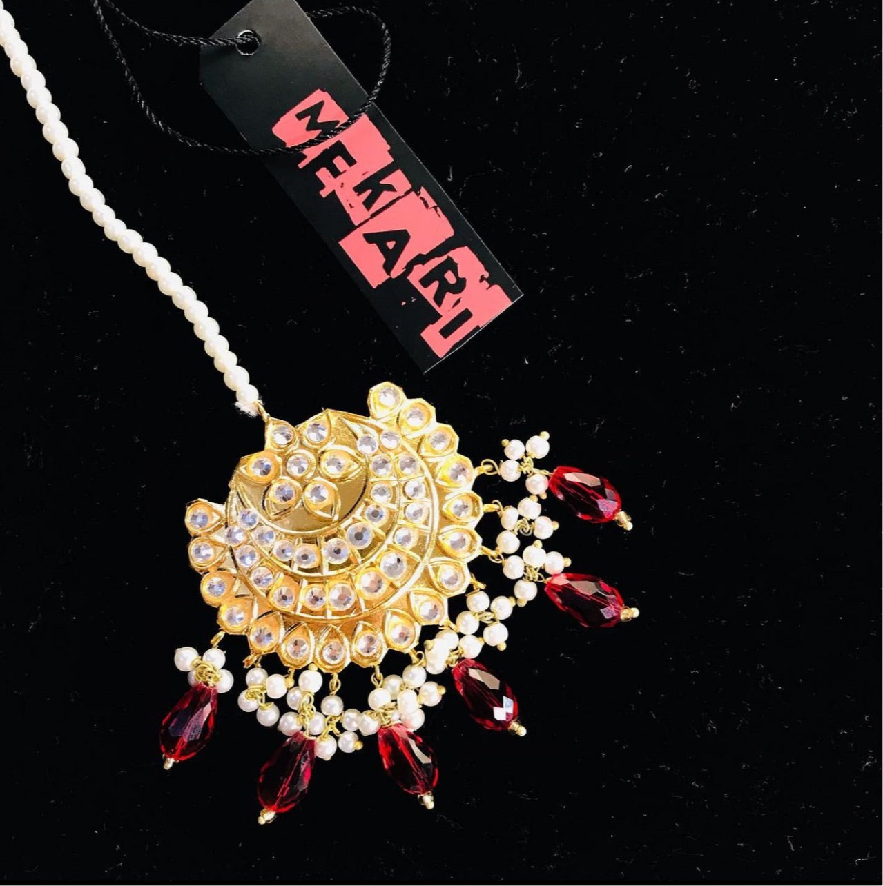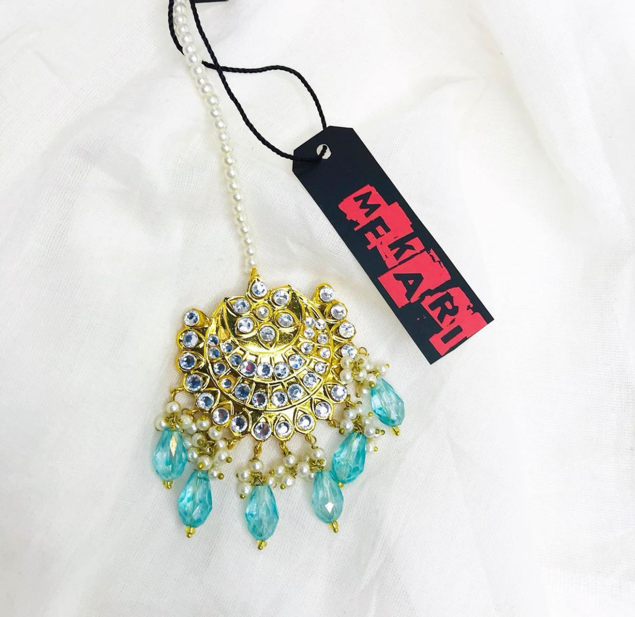 Meena Teeka features a lightweight design with elegant drop-shaped beads in mint green, maroon, and powder blue.Teeka Piece strung on a delicate pearl string. The piece showcases a traditional chandtara design embellished with shining stones, perfect for adding subtle color and charm to any outfit.