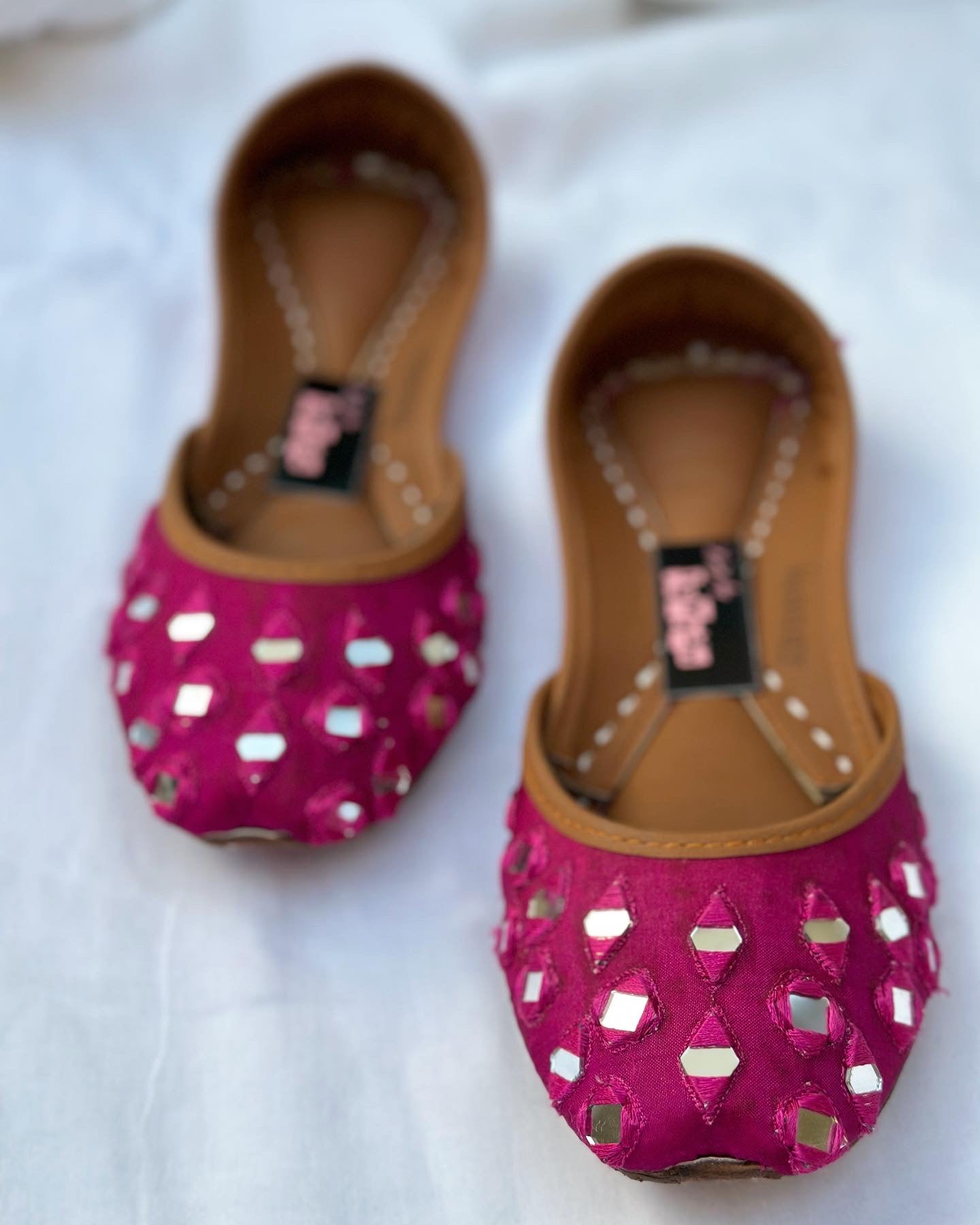 Handcrafted with care, this Mirror Khussa in hot pink is adorned with shining mirror work for a vibrant look. The skin-friendly design with smooth edges makes it comfortable for daily wear, parties, weddings, and gifting. Its handmade charm adds a unique touch.