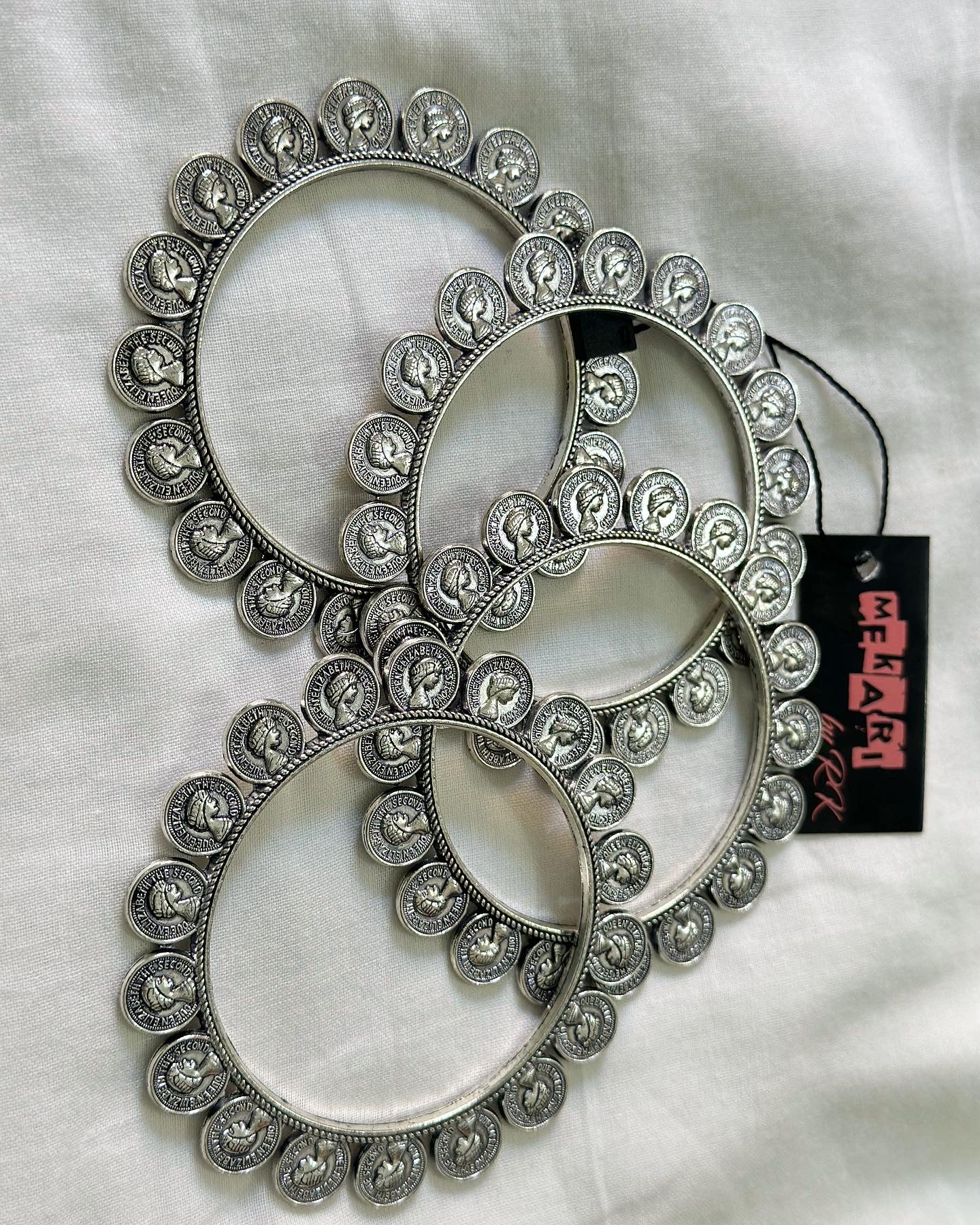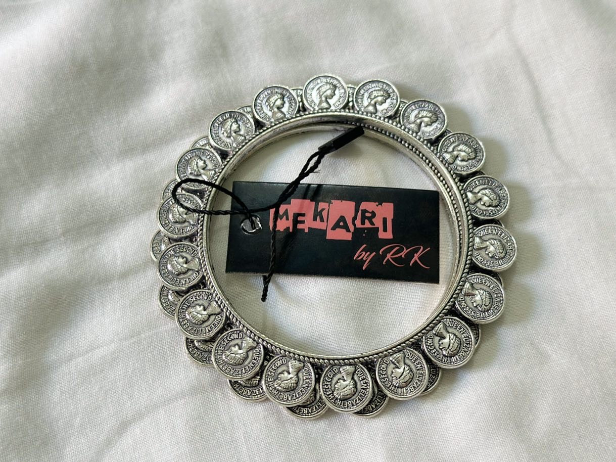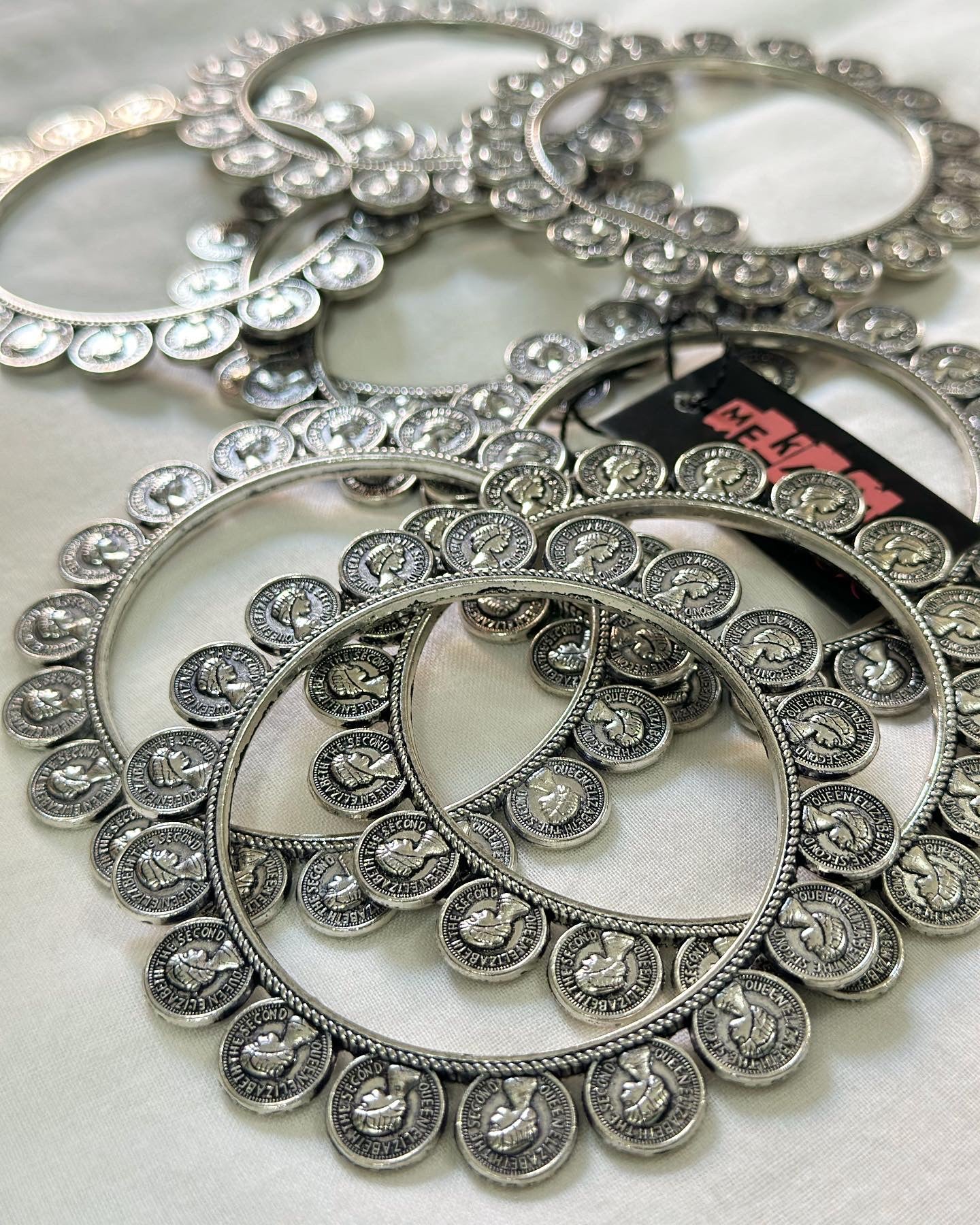 Made of oxidised German silver with a traditional coin design, skin-friendly with smooth edges. Bold and antique look. Limited pieces imported from India. Price is for a pair.