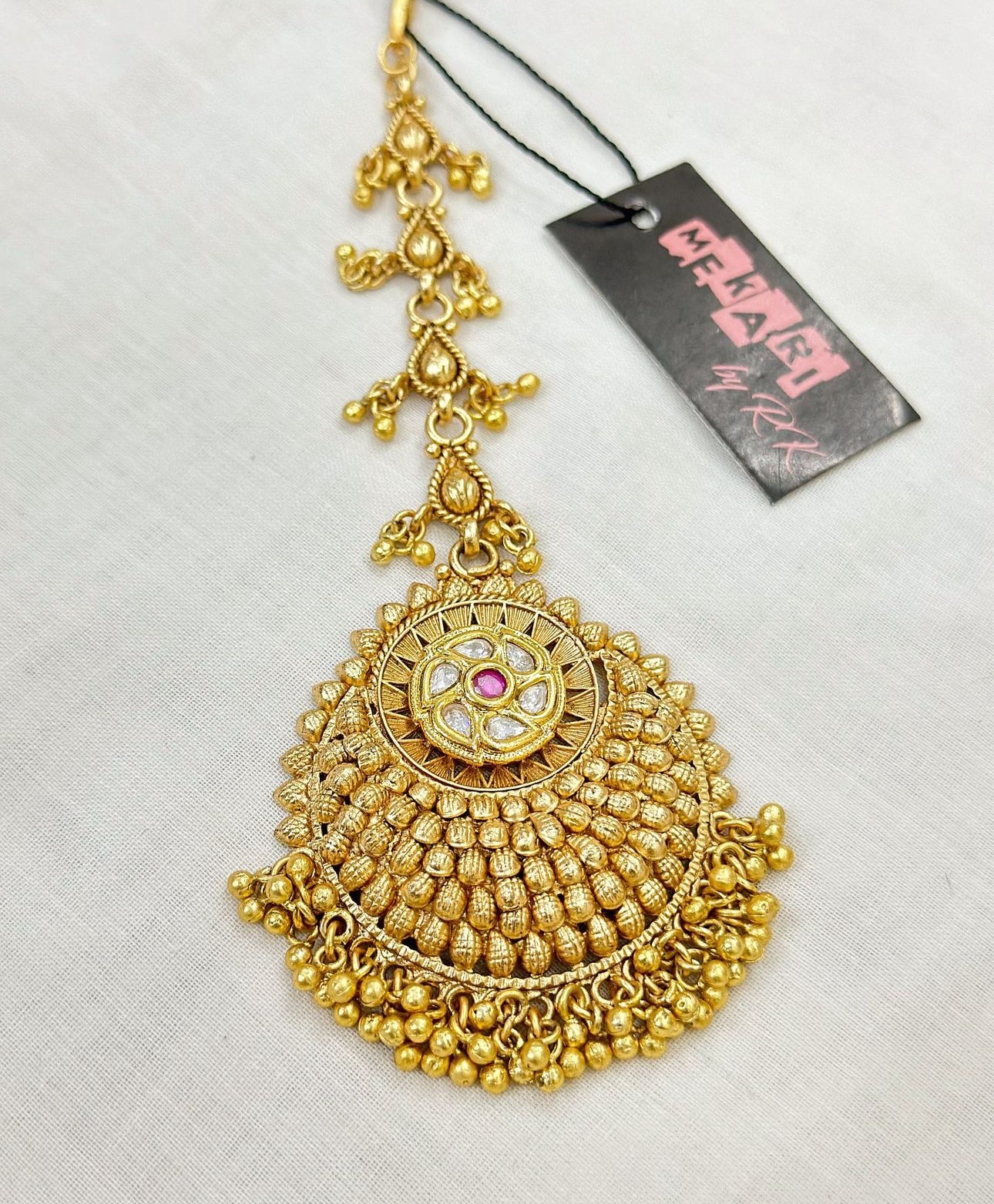 This Rajwari Teeka is made with a brass base and gold plating, featuring a pure gold Madrassi design inspired look. It is decorated with Polki Kundan, a central Polki ruby stone, and gold beads that hang delicately with a gold string. Made in India, it is a true masterpiece.