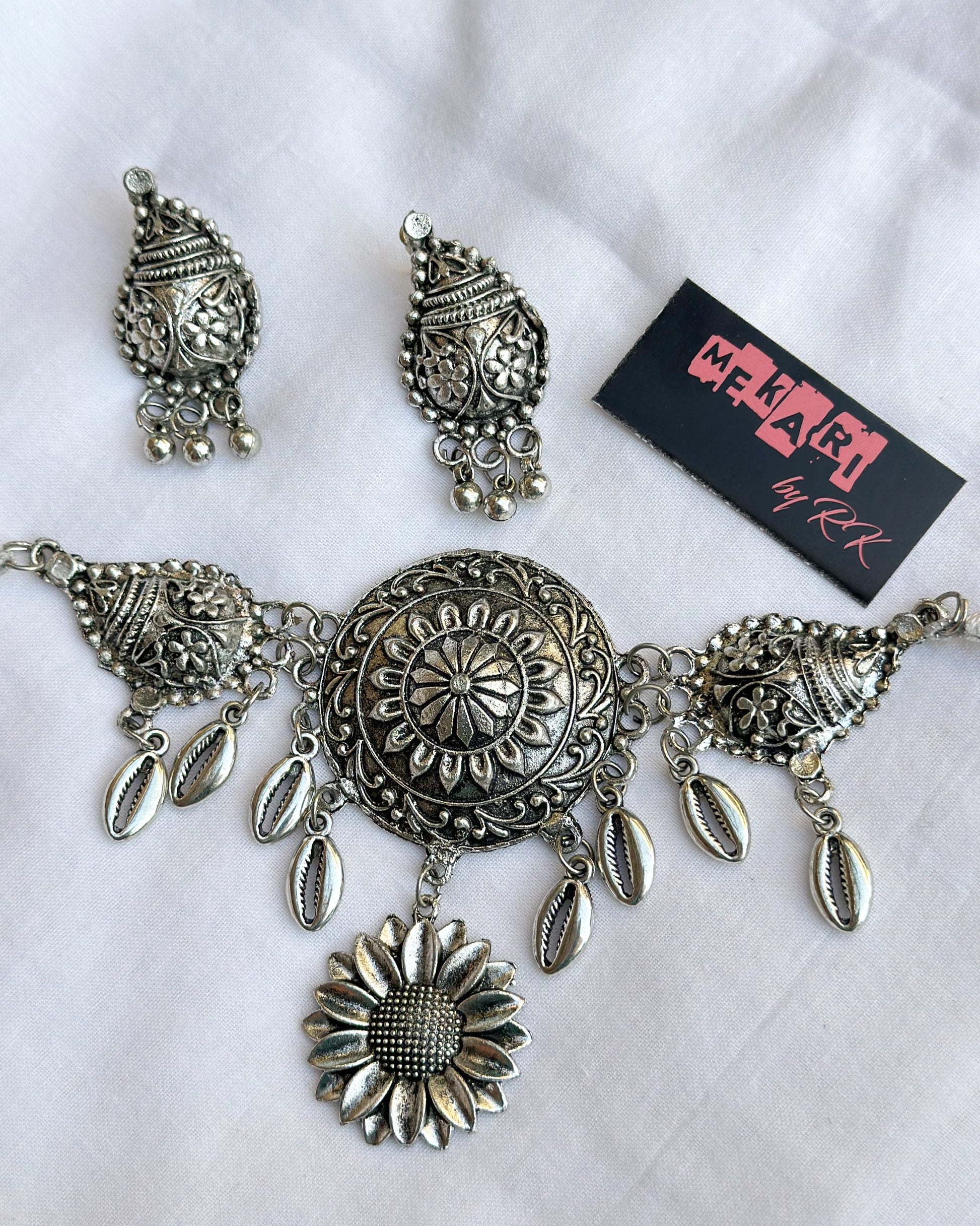 Crafted from German silver and made in India, the Silver Shell Choker Set features delicate seashell accents hanging from an oxidized German silver boho design, perfect for a stylish, laid-back look.