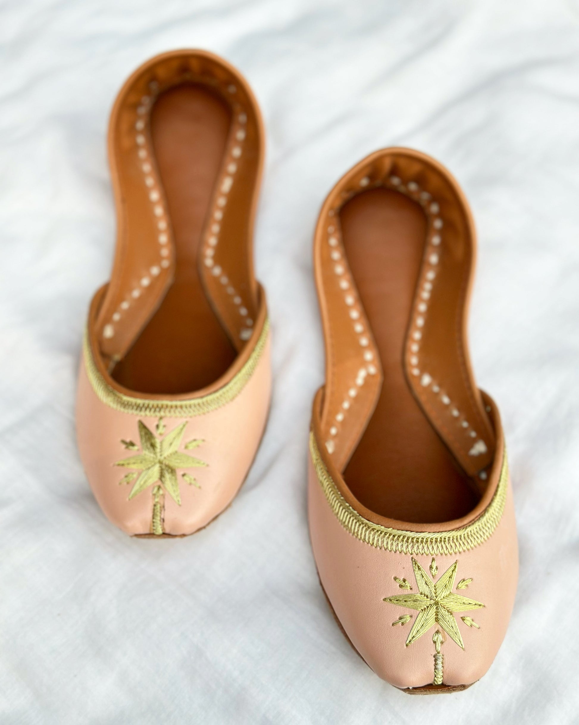 Made with faux leather, this Tilla Phool Khussa in pink features elegant tilla embroidery. The design is skin-friendly with smooth edges, offering comfort for daily wear, parties, weddings, and gifting. Its handmade finish makes it truly unique.