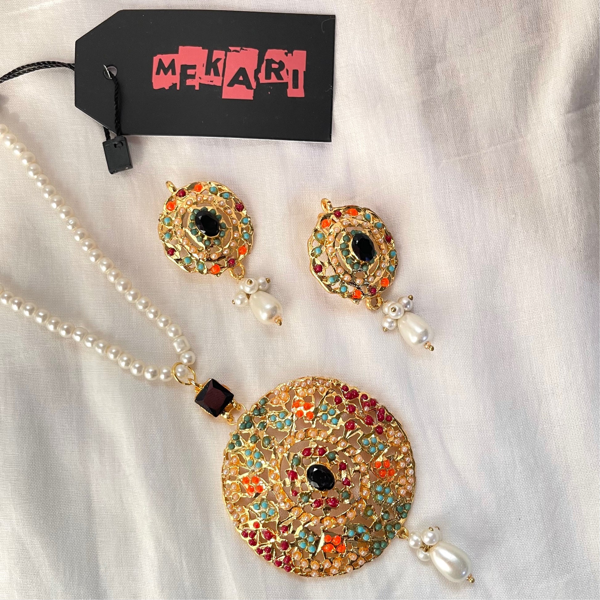 This Nauratan mala set features a black center stone and pearl drops with clusters of small pearls hanging. It includes a pearl mala with a nauratan beaded pearl pendant and matching earrings, making it an ideal choice for gifts and party wear.