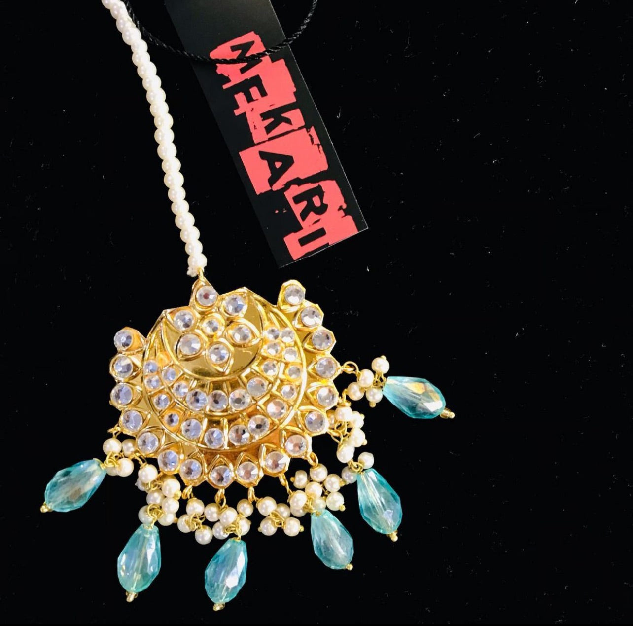 Meena Teeka features a lightweight design with elegant drop-shaped beads in mint green, maroon, and powder blue.Teeka Piece strung on a delicate pearl string. The piece showcases a traditional chandtara design embellished with shining stones, perfect for adding subtle color and charm to any outfit.