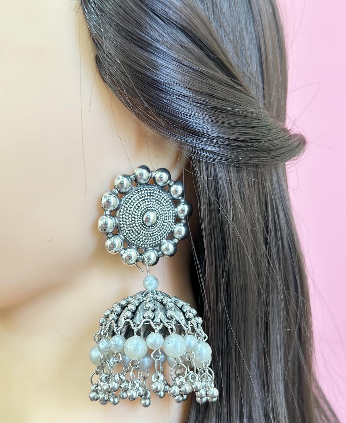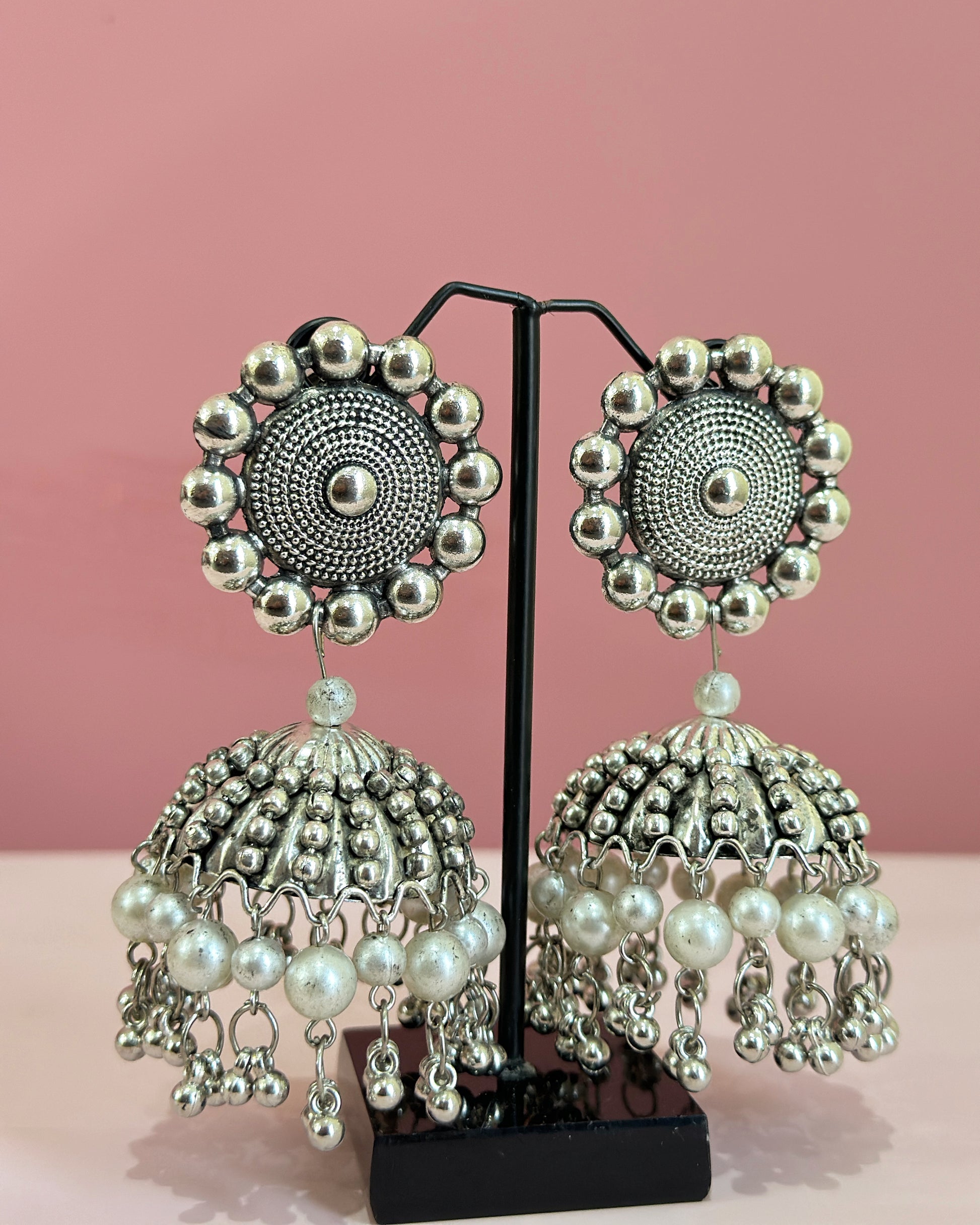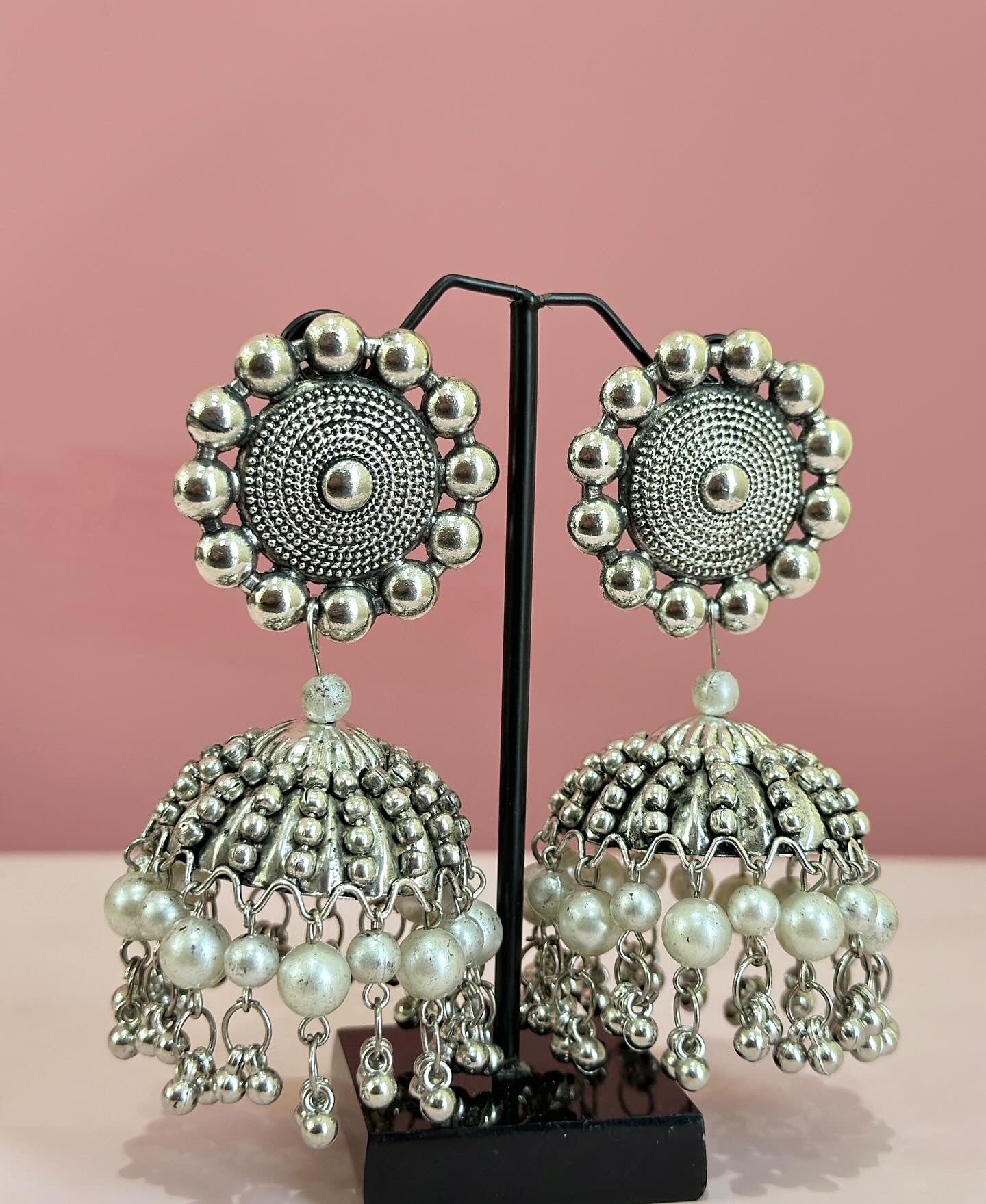 The Nissa Jhumki is made from high-quality oxidized German silver, ensuring durability and a unique antique look. Measuring 3 inches in length, these earrings are crafted in India with fine attention to detail. Their elegant design makes them perfect for both everyday wear and special occasions, adding a traditional touch to any outfit.