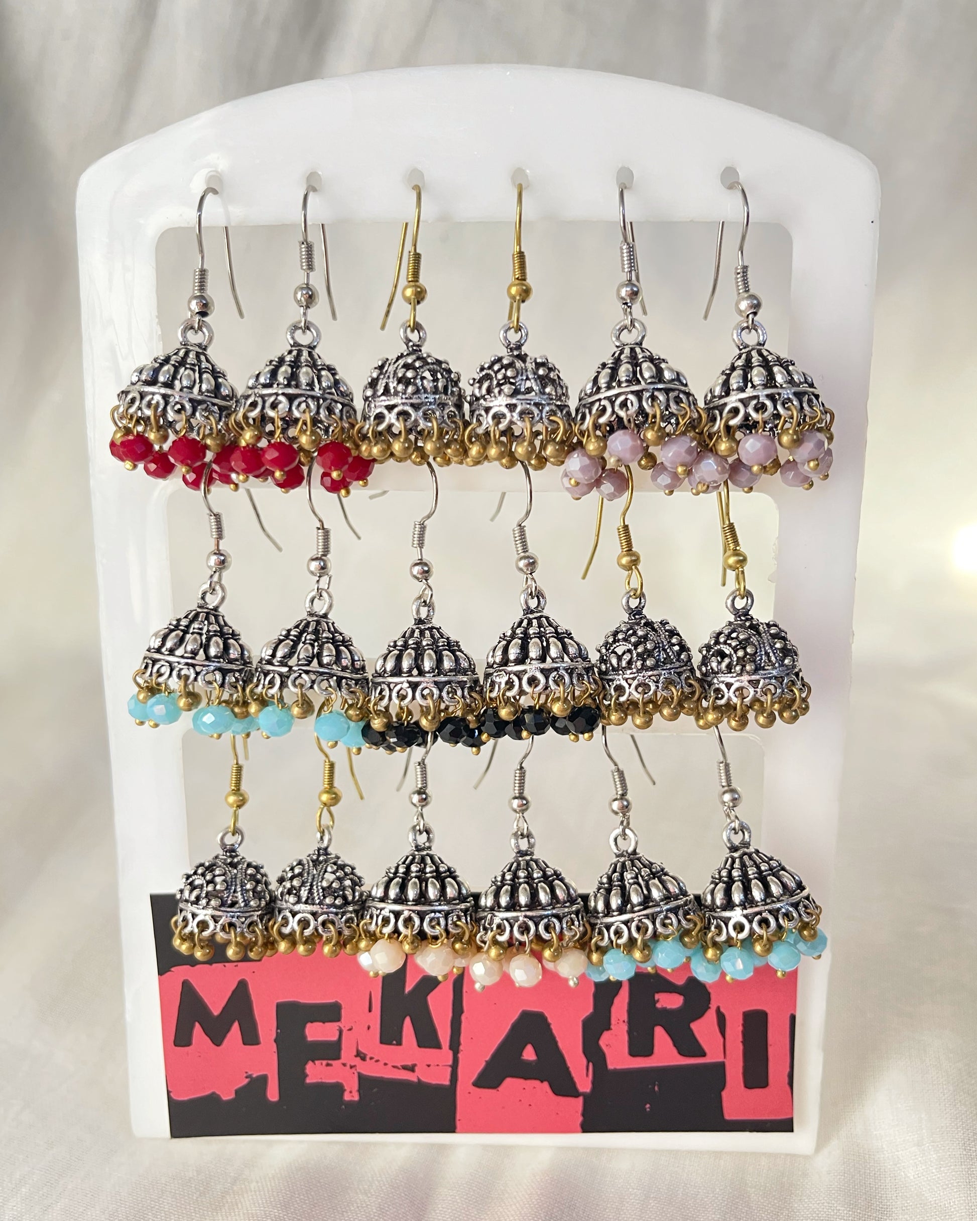 This pack features three pairs of small oxidized German silver jhumki, decorated with multicolored beads. They are lightweight, nickel-free, hypoallergenic, and resistant to rust. Made in India for durability and comfort. Each row includes three pairs, sold per row.