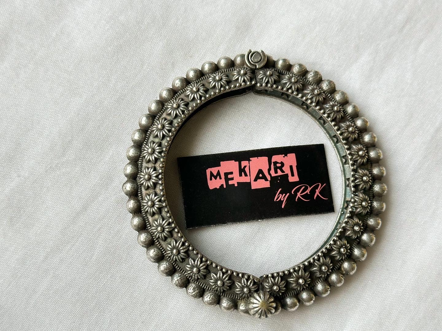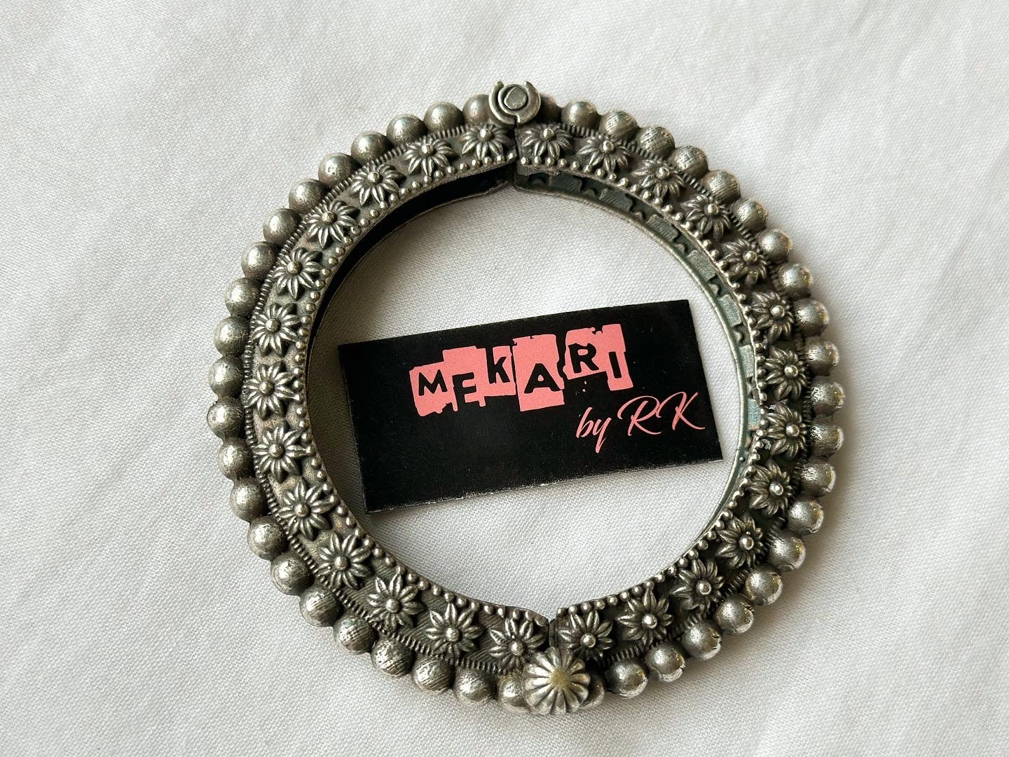 The Phool Kangan is crafted from oxidised German silver and features an openable design for easy wear. Made in India, this piece combines traditional charm with practical functionality.