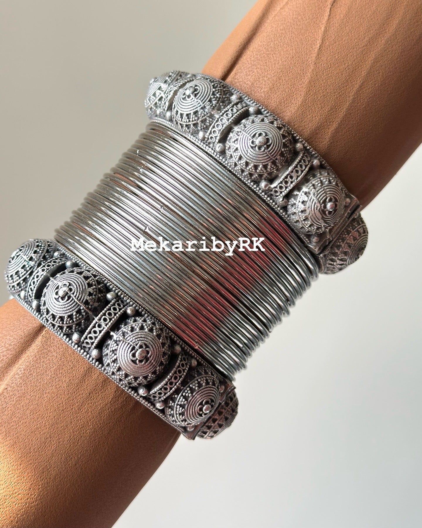 Crafted in oxidised German silver with an adjustable design. Premium quality, skin-friendly with smooth edges, durable for weddings, parties, or gifting. Only few pieces imported from India.