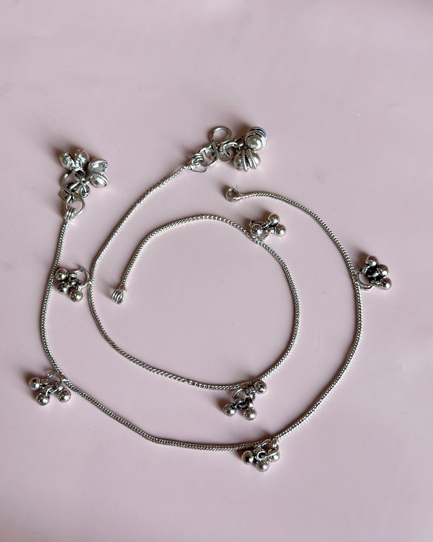 Made with oxidised German silver, this 13-inch pair is durable, skin-friendly, and smooth-edged for comfort. Features three ghungru charms that donβt produce sound, perfect for daily wear, weddings, parties, or gifting.
